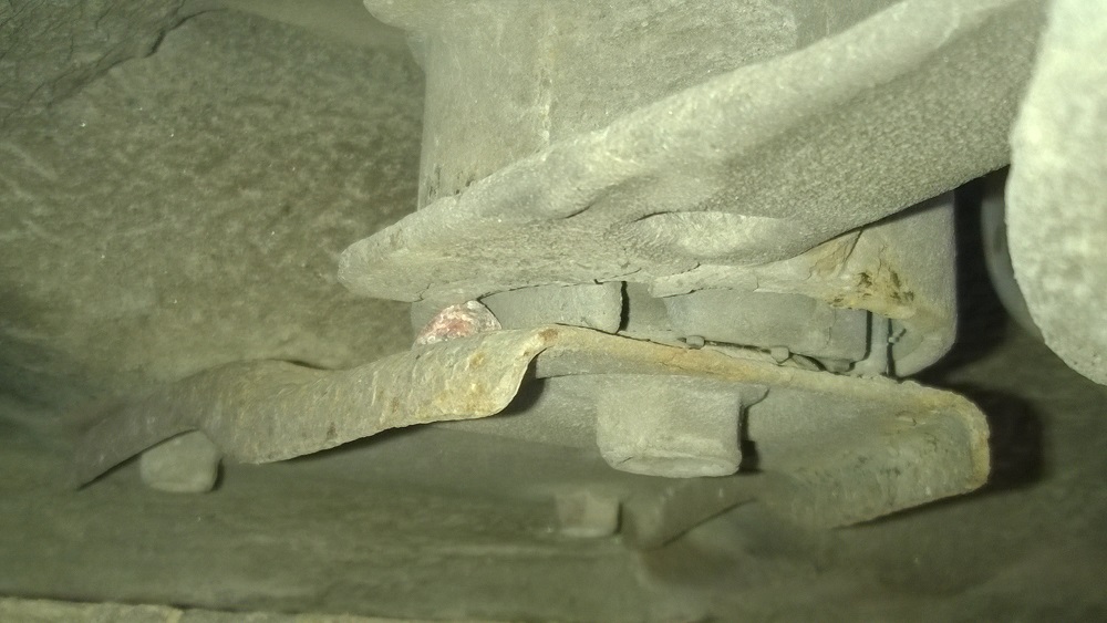 Auto uudelleen ylös ja tarkempaa silmittelyä. Mitään ei tuntunut löytyvän - kunnes nostin kädellä perän etupäätä kannattelevaa pokkipalkkia. Alas laskiessa selvä kolahdus. Jaahas, pusla rikki?
