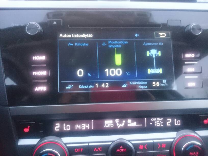 Vertailun vuoksi bensakoneessa (Outback 2,5 MY16) öljynlämpöjä. Viikonloppuna ajelin peräkärry kanssa Oulu-Posio-Oulu. Pakkasta 16-20 astetta ja öljynlämmöt vaihteluvat 98-100 asteen välillä. Nesteille on vain viisarinäyttö, mutta se oli samassa asennossa kuin kesäkelillä, asteikon puolivälissä tai hieman sen yli. Ja ei ole minkäänlaista maskisuojaa tms.