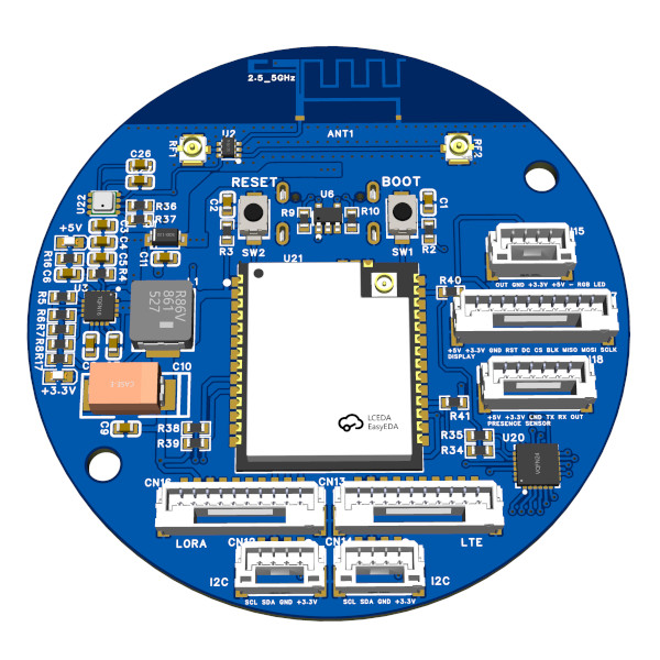 Moduuli käyttää ESP32-C5-WROOM-1U-N8-R8 kontrolleria ja siitä löytyy mahdollisuus käyttää joko levyllä olevaa antennia (välijohto) tai ulkoista antennia.